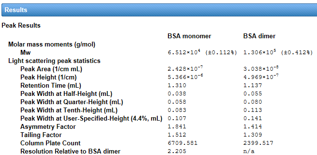 Did you know that ASTRA can be used to assess the quality of chromatography with statistics such as peak height, column plate count, peak width, asymmetry, and resolution? In fact, this analysis is built into every online method in the software so there’s no need to use your chromatography software to perform these calculations. This is particularly advantageous when using Wyatt’s HPLC Service to control your HPLC hardware or performing FFF-MALS experiments using VISION™.