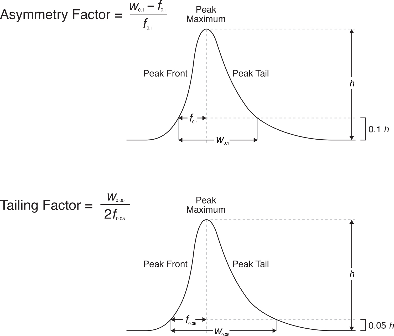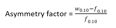 The Asymmetry Factor provides information about nonideal peak shape. ASTRA uses the US Pharmacopeia definition (USP40) to calculate tailing and asymmetry factors, see Figure 3. Note this may be calculated differently in other chromatography software.