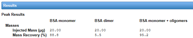 The mass recovery is in Results -> Peaks -> Masses. Use the Report Designer to add this parameter if it’s not already displayed in your Report. An example for the BSA chromatogram in Figure 4 is shown below. In addition to the BSA monomer and BSA dimer peak, a peak has been drawn across all peaks (monomer, dimer, and higher oligomers). Mass recovery across all peaks is 95%, slightly higher than monomer and dimer. (This is due to trimers and higher oligomers.)