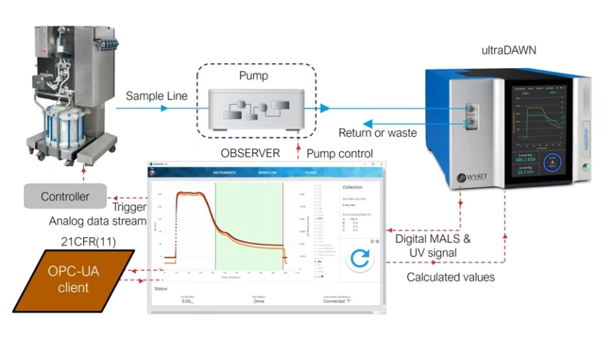 On-line RT-MALS combines an ultraDAWN with an auxiliary pump to draw sample from the process unit (here an ÄKTA™ ready preparative LC system). OBSERVER software orchestrates the measurements, sychronizing with the chromatography steps, calculating product attributes and feeding results back to the process controller such as UNICORN™ software or an OPC-UA client.