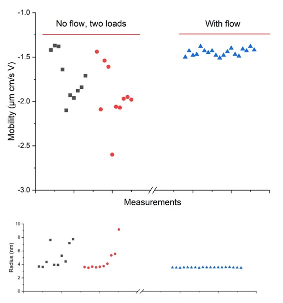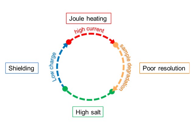 Highly conductive solutions present a significant challenge for ELS. To produce an appreciable electric field and induce particle motion, high voltage must be applied. However, high voltage generates strong electrolysis at the electrodes, causing the formation of gas bubbles that interfere with the electric current and induce noise in the measurement.
