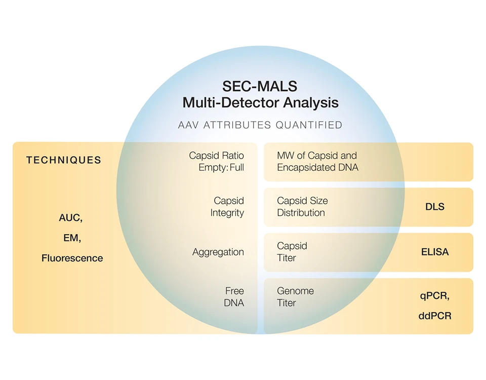 Size-exclusion chromatography combined with multi-angle light scattering (SEC-MALS) delivers high-precision AAV quantitation in a single 30-minute experiment. The following AAV quality attributes are measured simultaneously by SEC-MALS: