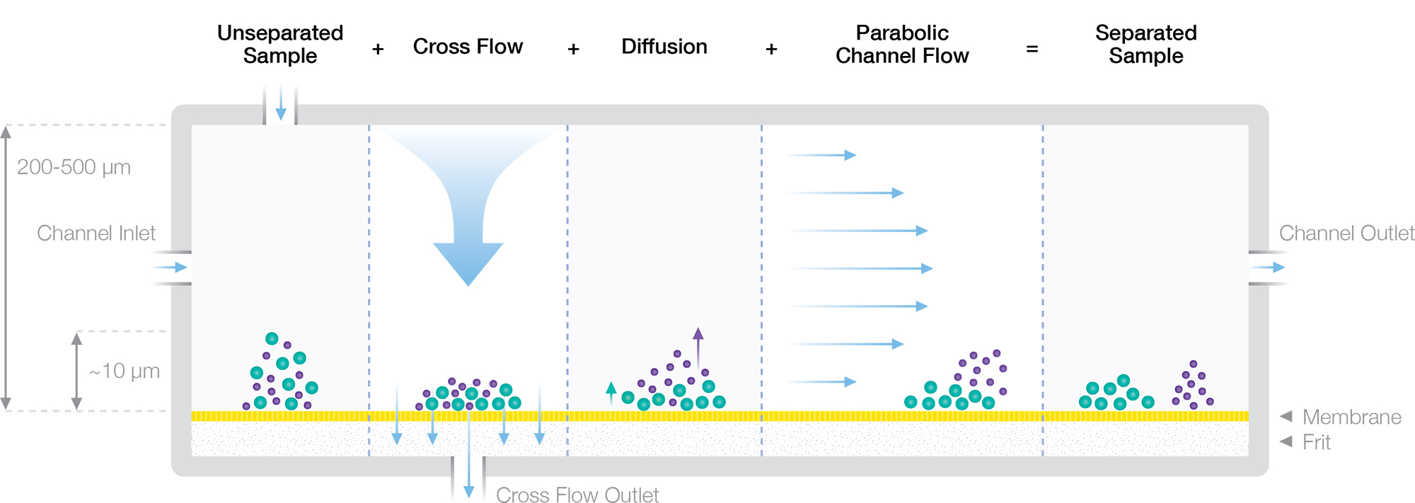 载液与膜平行流动,但通道末端的收缩会迫使部分流体通过膜,从而形成一个“交叉流场”,将颗粒集中到膜上。扩散作为一种反作用力,驱动颗粒返回通道,导致膜上方的高度分布取决于颗粒的平动扩散系数Dt、流体动力学半径Rh以及横流速度。分离产生于层流中根据颗粒在膜上的高度不同的输送速度。
